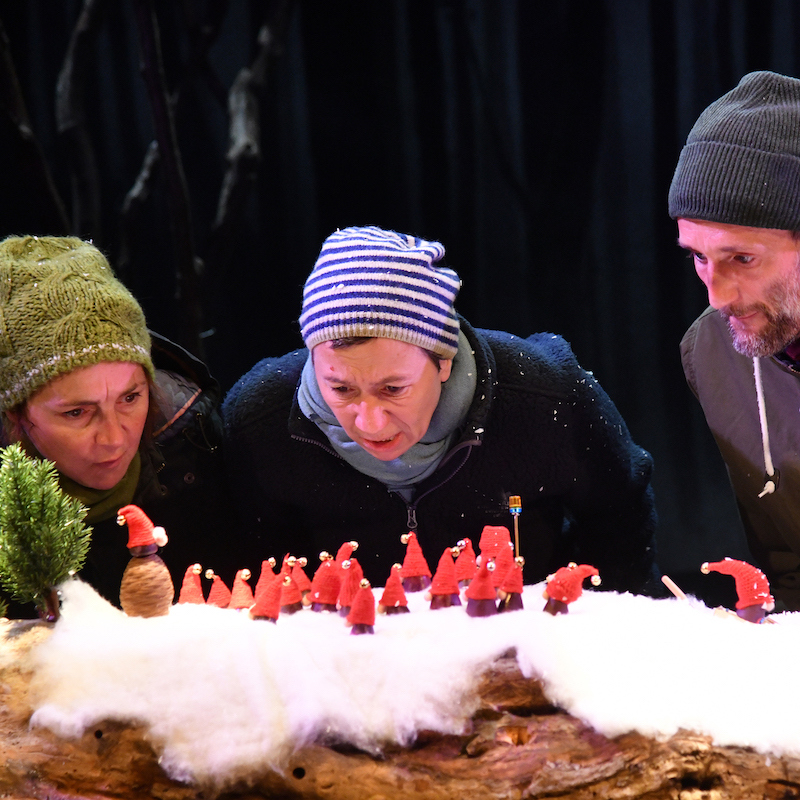 C’est dans un magnifique décor, qui nous immerge au plus profond des bois enneigés, que trois artistes qui n’ont pas froid au cœur nous racontent avec de tout petits personnages cette histoire d’hospitalité (ou de l’inhospitalité !), de jalousie, de solidarité, de petitesse, où nous reconnaissons nos tentatives et nos faiblesses humaines.